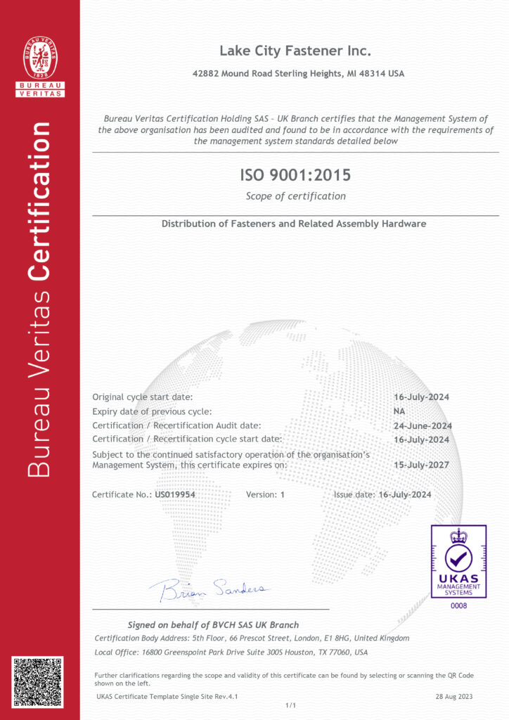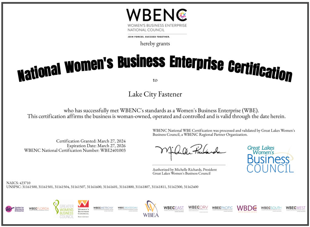 Lake City Fastener is a trusted supplier committed to quality, reliability, and service. Backed by industry-leading credentials, the company is proudly recognized as a WBENC-Certified Women’s Business Enterprise, ISO 9001 certified by Bureau Veritas for quality management, and a Women-Owned Small Business (WOSB) certified by the U.S. Small Business Administration. These certifications highlight Lake City Fastener’s dedication to excellence, diversity, and compliance with the highest standards.